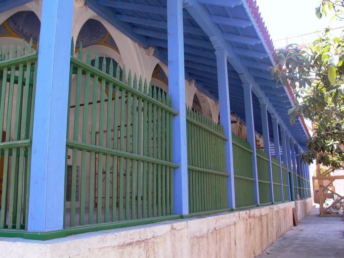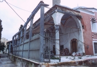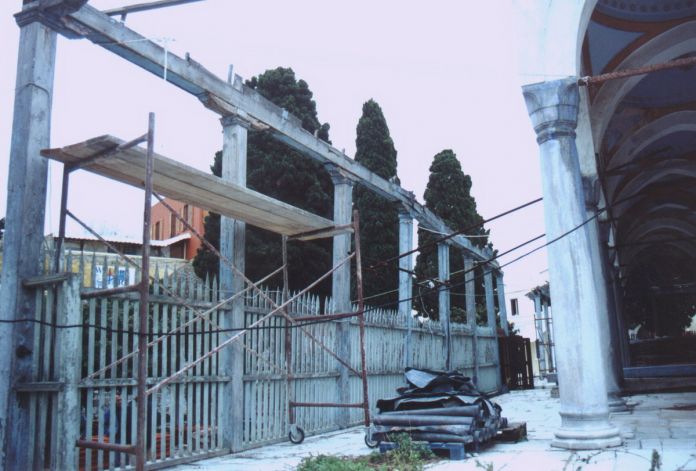 Ανάμεσα στους πεσσούς υπάρχει ψηλό ξύλινο κιγκλίδωμα, που αποτελείται από πυκνά κατακόρυφα ξύλινα στοιχεία τετραγωνικής διατομής που καταλήγουν σε οξείες άκρες και τα διαπερνούν τρεις οριζόντιες τραβέρσες. Το κεντρικό άνοιγμα κλείνει ψηλή πόρτα όμοιας μορφής με το κιγκλίδωμα. Οι άλλες δύο πόρτες, που δεν σώζονται ήταν της ίδιας μορφής, αλλά κοντύτερες όπως διακρίνεται σε παλιές φωτογραφίες.