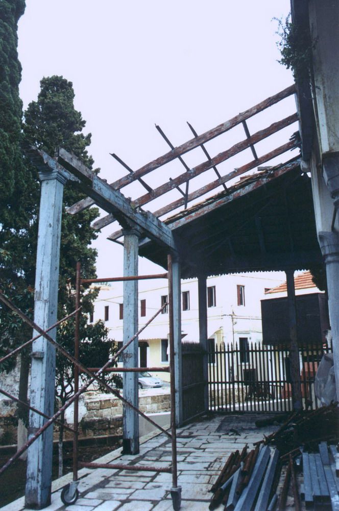 Όλα τα ξύλινα τμήματα του στεγάστρου εκτός από τους οριζόντιους δοκούς και τους κίονες οι οποίοι καλύπτονται από σανίδες, έχουν επικαλυφθεί με χρώματα (ελαιοχρώματα). Διαπιστώθηκαν έξι επάλληλες στρώσεις χρώματος σε τόνους του μπλε. Η χρωματική επιφάνεια παρουσίαζε συρρικνώσεις, κρακελαρίσματα, απολεπίσεις και αποφλοιώσεις κατά τόπους.