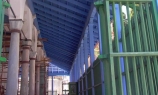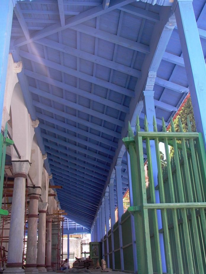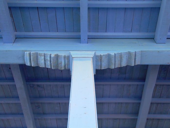 Βαφή όλων των ξύλων, εκτός των κιόνων και των δοκαριών, μετά την κατασκευή του στεγάστρου σε τόνο του μπλε.